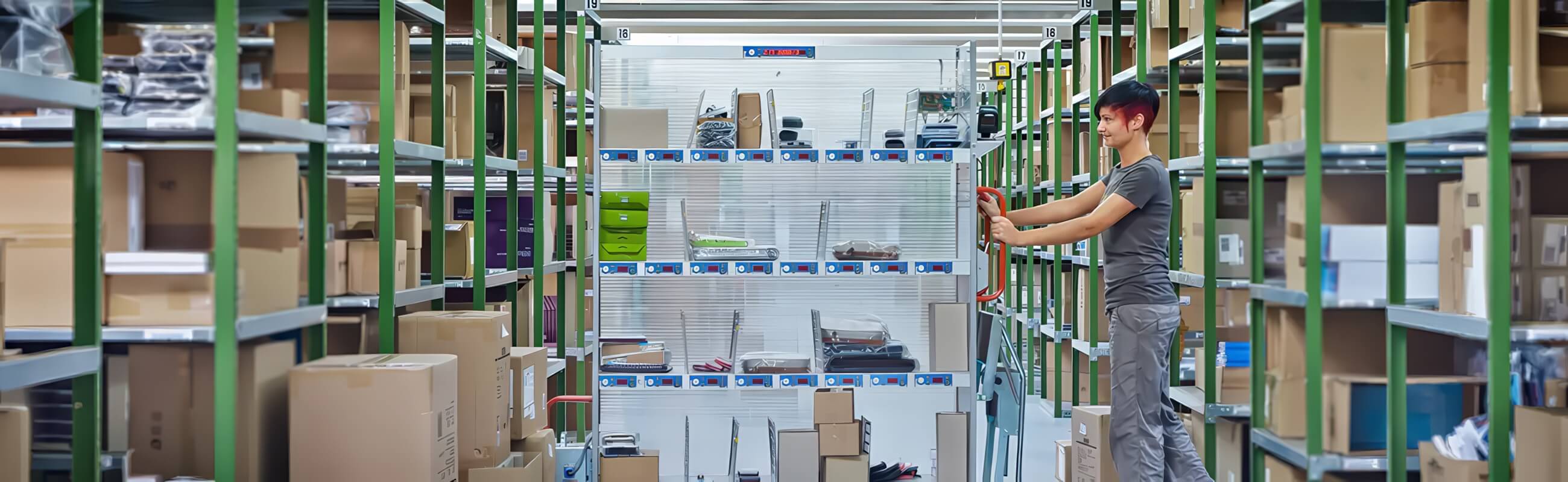 Nach der Ablage der Artikel betätigt er die Quittierungstaste der Fachanzeige. Die Blickfangleuche und die Mengenanzeige erlöschen. Gleichzeitig werden die Pick-Informationen an das Warenwirtschafts- oder Lagerverwaltungssystem übermittelt und dort direkt verbucht.