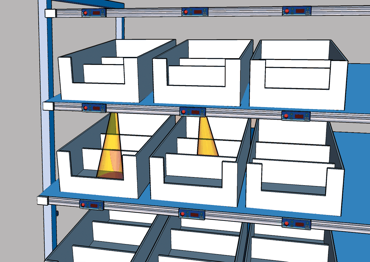Die Pointer-Module sind vor allem bei der Ware-zum-Mann Kommissionierung sinnvoll, wenn die automatisch angedienten Quellbehälter nicht sortenrein beziehungsweise mehrfach unterteilt sind. In diesen Fällen ist eine Benutzerführung via Display meist nicht ausreichend.
